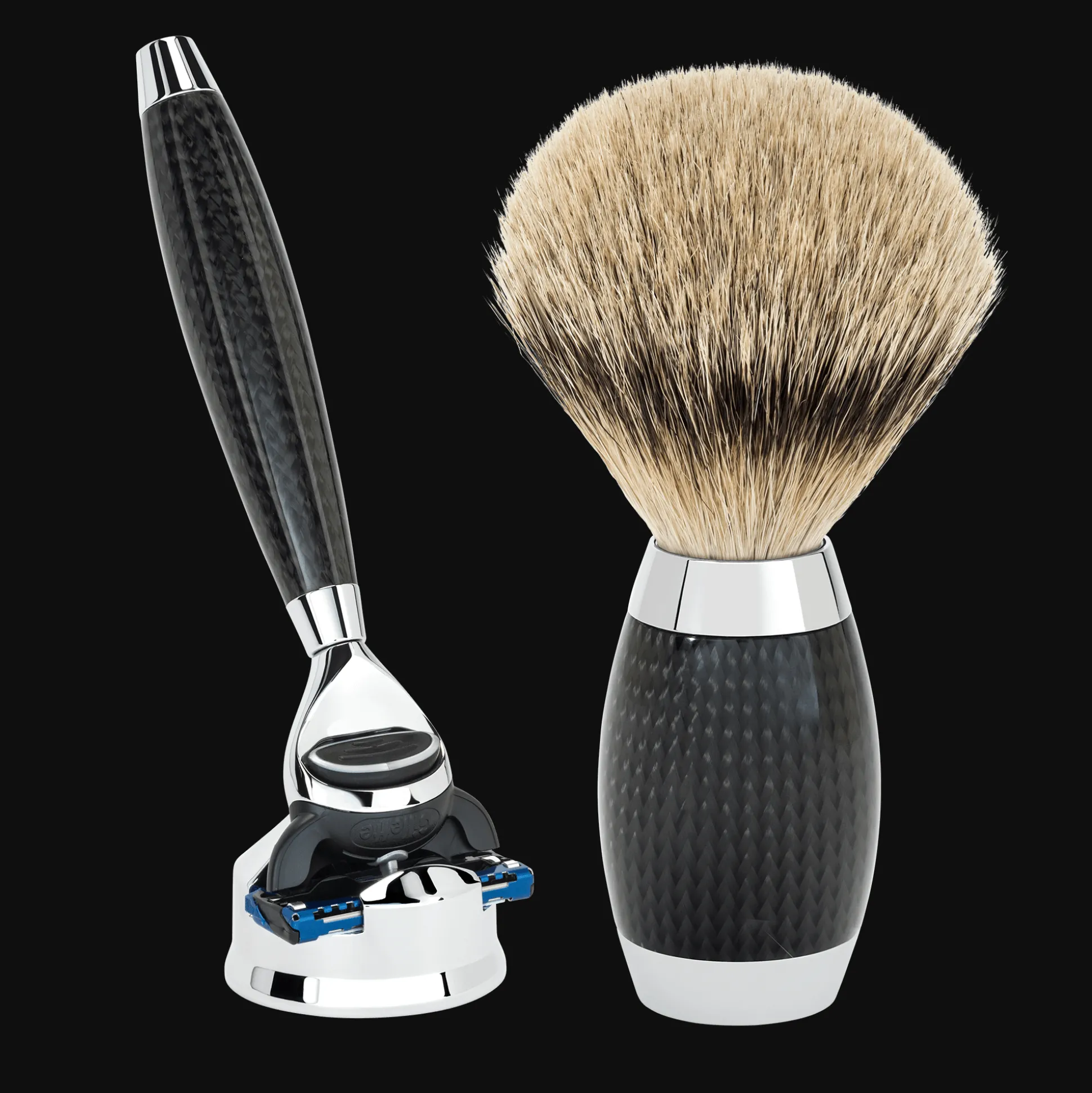 Einzelne Rohlinge – später Griffe von Pinseln und Rasierern – werden mit den Geweben bespannt. Dann werden sie in eine Form eingelegt, ihre Fasern gleichmäßig ausgerichtet und in mehreren Arbeitsgängen mit Edelharz durchtränkt und gehärtet. So entstehen die glänzenden Oberflächen mit dynamischen Spiegelungen.