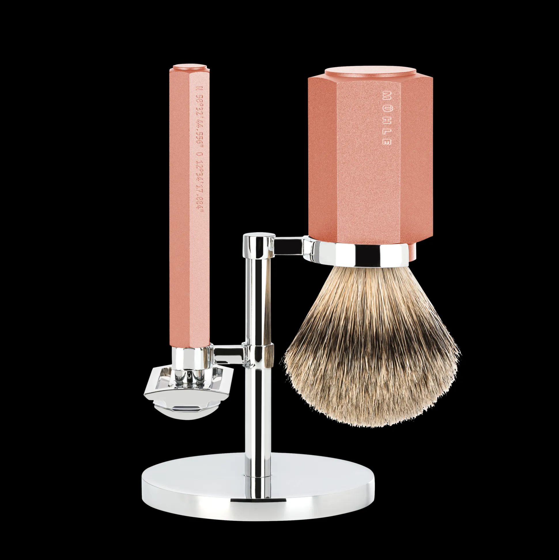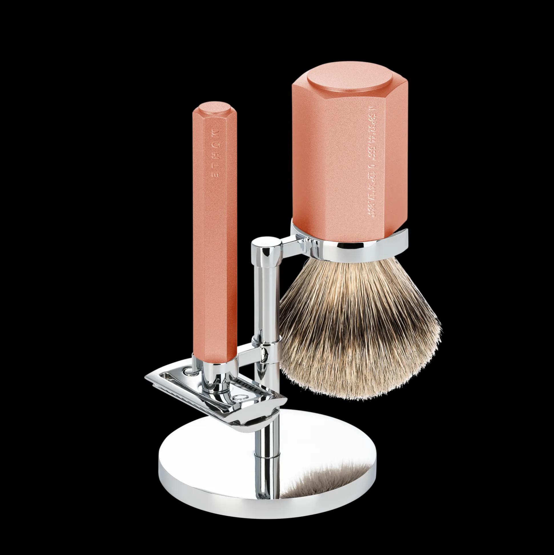 Gekonnt anecken lässt sich mit der Serie HEXAGON, die in Zusammenarbeit mit dem Berliner Designer Mark Braun entstand. Das sechseckige Design ist eine Hommage an die archetypische Form von Werkzeugen oder Schreibgeräten. Es verspricht Ergonomie, Griffigkeit, Funktionalität. Das matte Finish in den Farben Graphite und Forest wird ergänzt durch einen puristisch anmutenden Silberton. Den perfekten Kontrapunkt dazu setzen die hochglänzenden, verchromten Oberflächen von Rasierhobel und Halter. HEXAGON: Design von Welt. Made in Stützengrün.