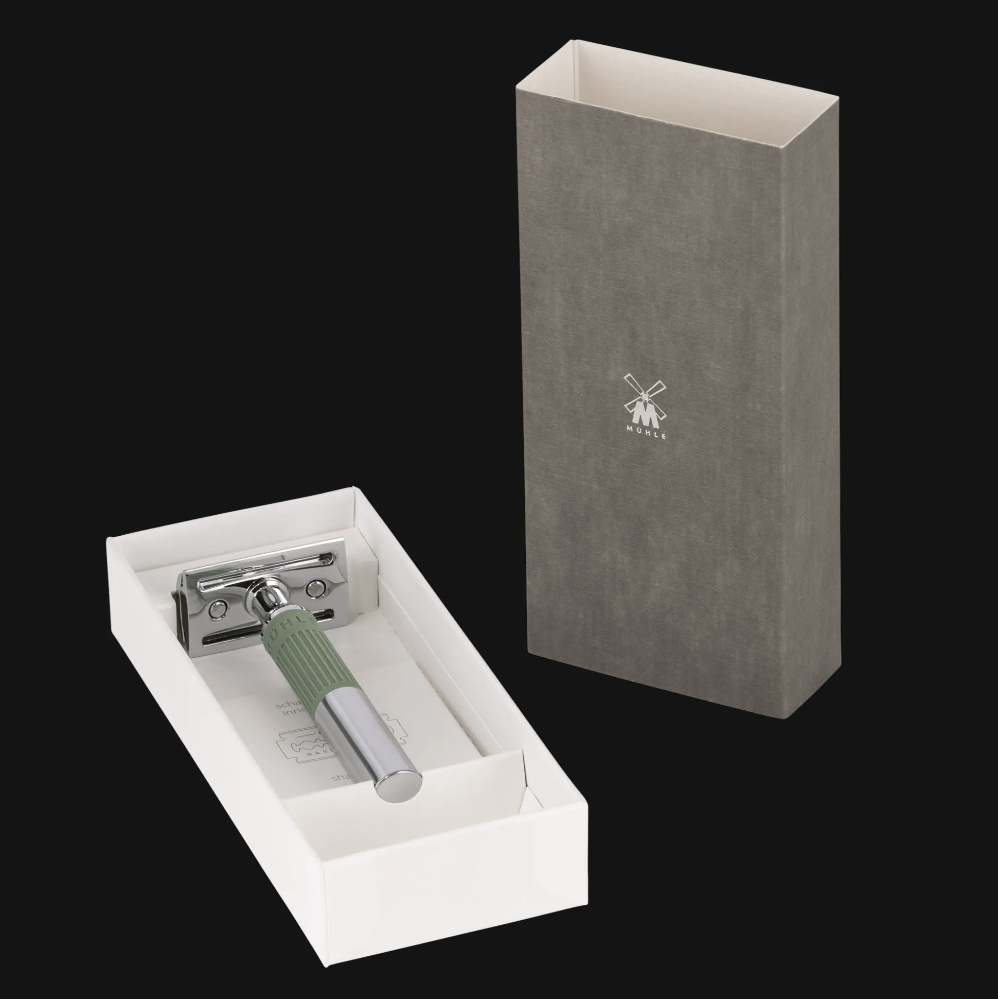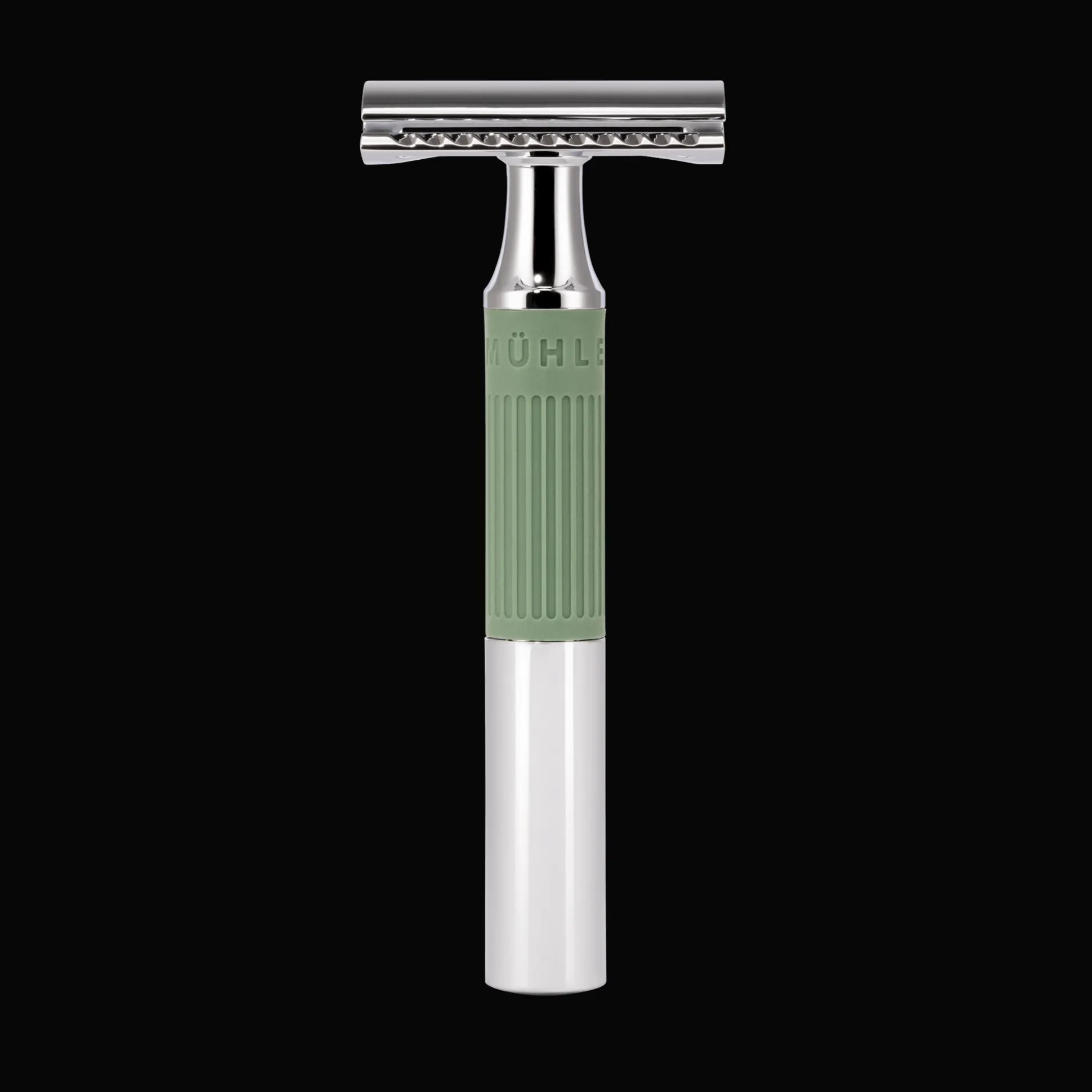 Im Kontrast dazu kommen die rutschhemmenden, warmen Griffelemente in klassischem Schwarz oder erfrischend pastelligem Gletscherblau und Salbeigrün hervorragend zur Geltung. Ihre weiche, linierte Oberfläche sorgt ganz nebenbei für den perfekten Grip während der Nassrasur.