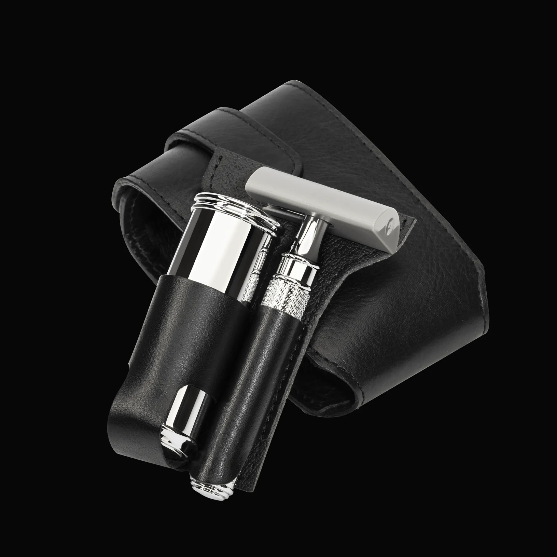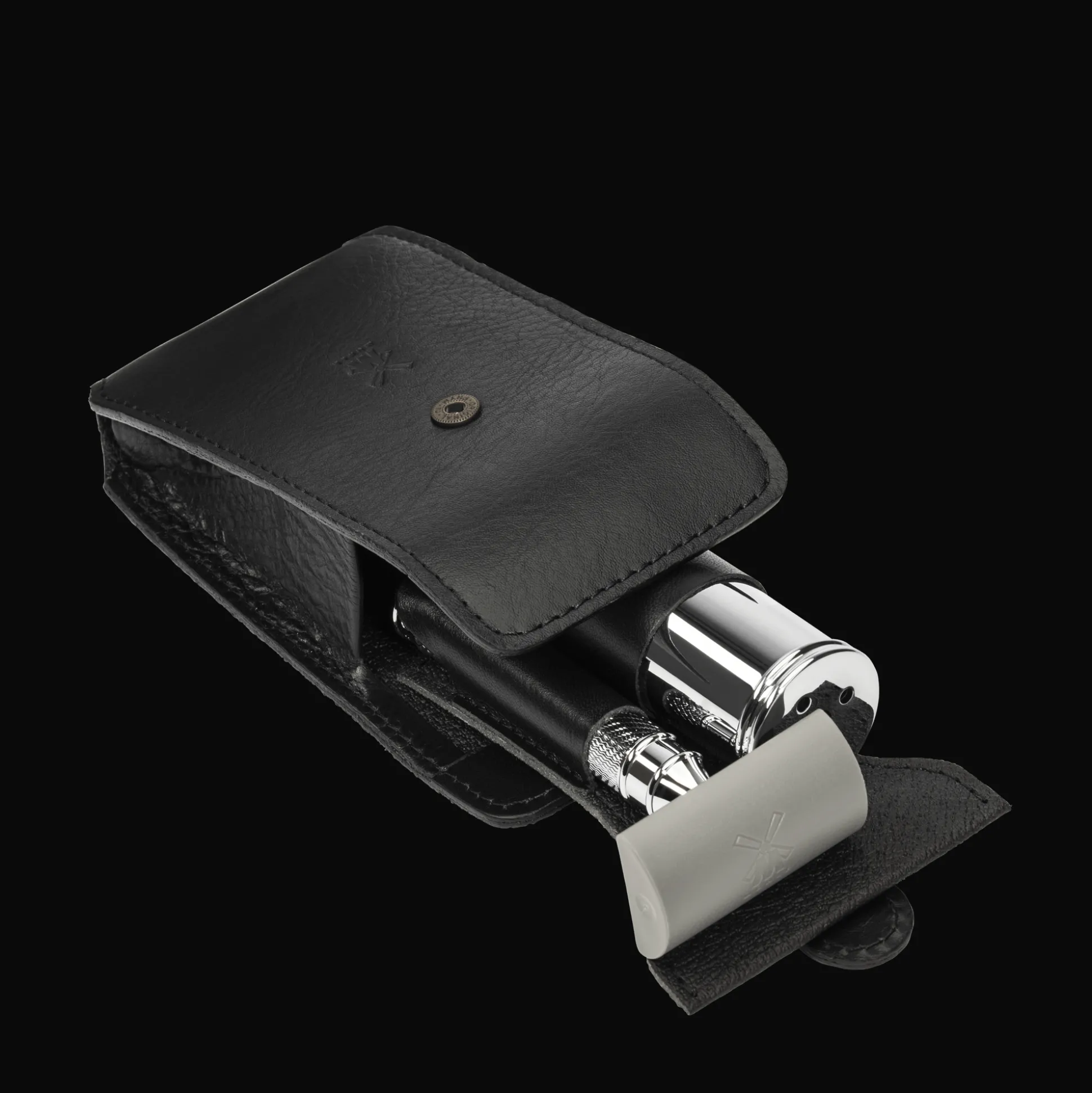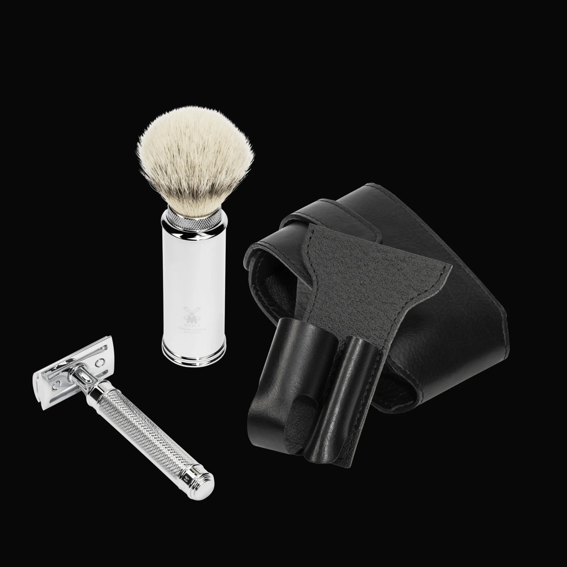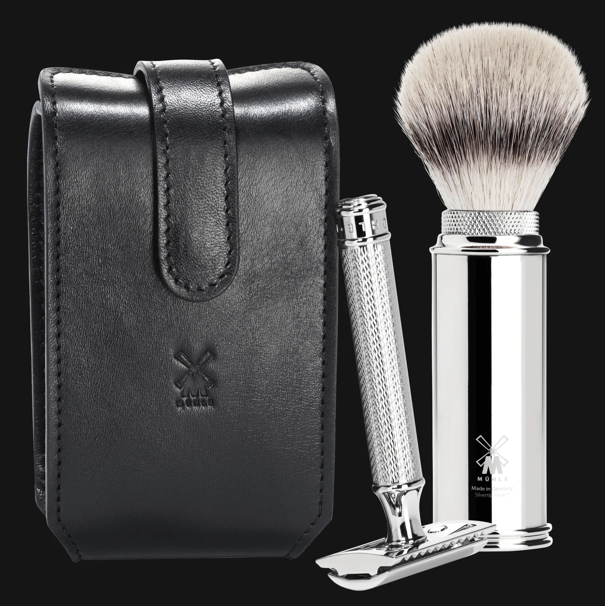 Dieses Reiseset enthält neben dem Lederetui, einen Reiserasierpinsel aus verchromtem Metall mit hochwertigen Silvertip Fibre® Fasern (Kopfdurchmesser 21 mm) und den absoluten Klassiker unter den Rasierhobeln, den R 89 aus dem Hause MÜHLE. Ebenfalls enthalten ist der passende Klingenschutz.