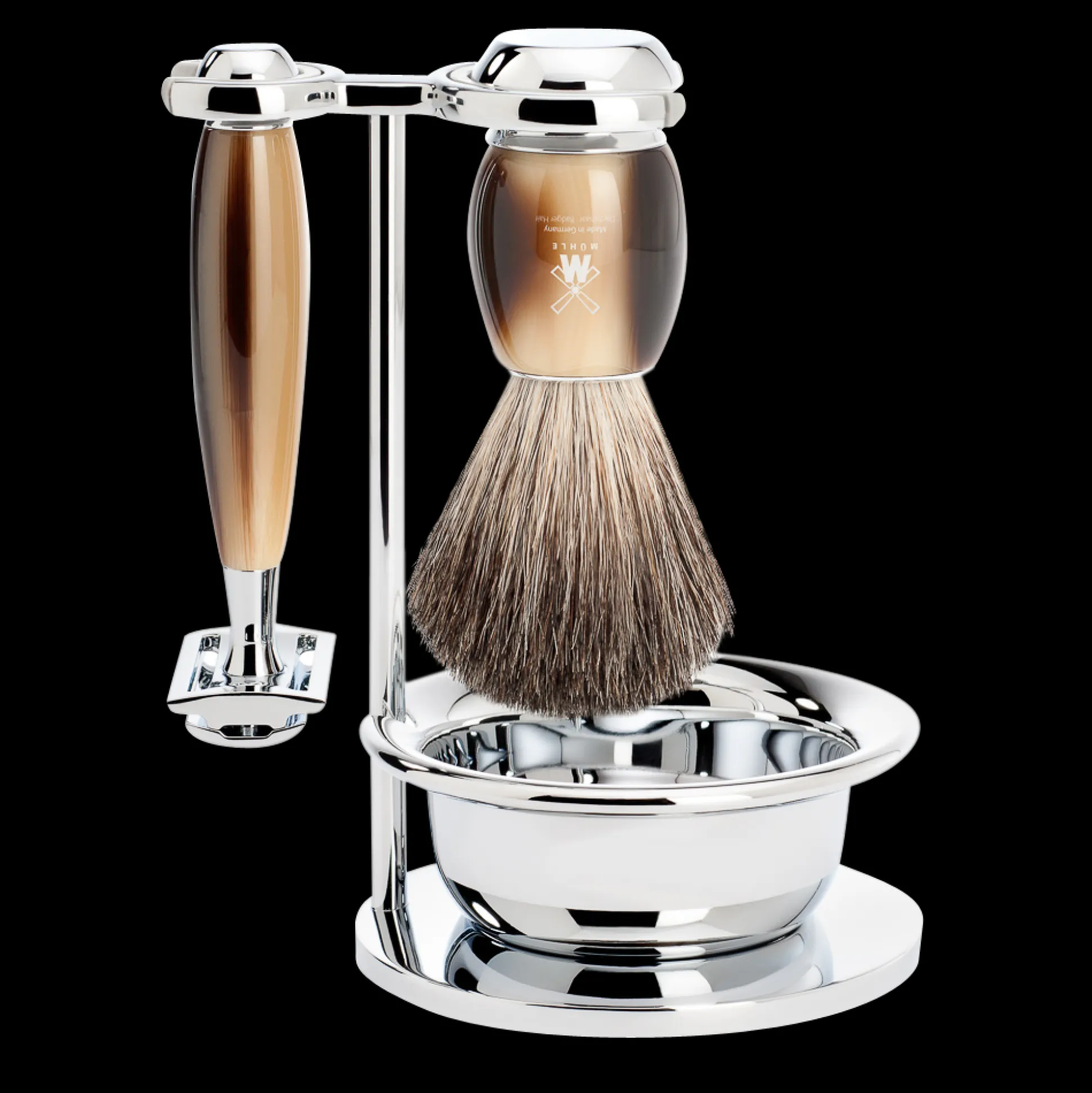 Klassische Form neu gedacht. Die Serie VIVO ist das zeitgemäße Update der Urform eines Rasierpinsels. Die Griffe zeigen die archetypische, bauchige Wölbung. Der gegenläufig geschwungene Sockel aus hochglänzendem Chrom weckt Erinnerungen an die traditionelle Rasurkultur und garantiert zugleich den sicheren Sitz im speziell entwickelten Halter mit Kunststoffeinsatz. Den neu interpretierten Klassiker fertigt MÜHLE aus Edelharz und Pflaumenholz.