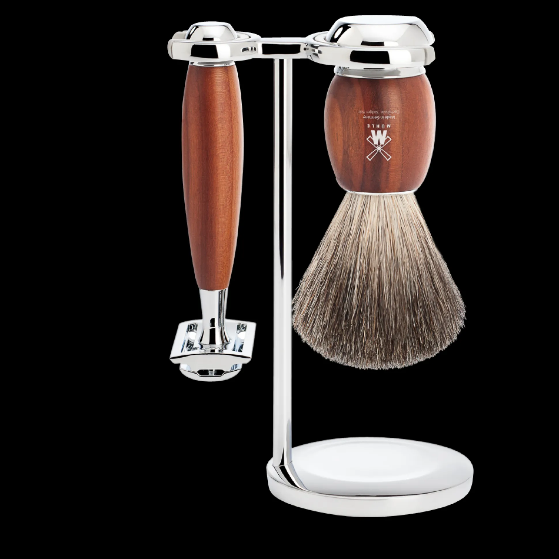 Klassische Form neu gedacht. Die Serie VIVO ist das zeitgemäße Update der Urform eines Rasierpinsels. Die Griffe zeigen die archetypische, bauchige Wölbung. Der gegenläufig geschwungene Sockel aus hochglänzendem Chrom weckt Erinnerungen an die traditionelle Rasurkultur und garantiert zugleich den sicheren Sitz im speziell entwickelten Halter mit Kunststoffeinsatz. Den neu interpretierten Klassiker fertigt MÜHLE aus Edelharz und Pflaumenholz.